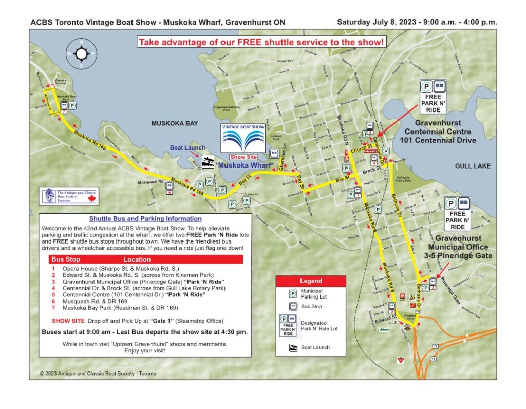 The 42nd Annual Vintage Boat Show runs from 9:00 AM to 4:00 PM and is free for the whole family. There is also free offsite parking and free shuttle buses. (See map below). Unfortunately, pets are not allowed but service animals welcome.
