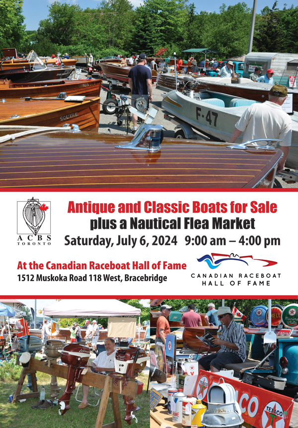 Boat lovers across Ontario were crushed when The Canadian Antique & Classic Boat Society, (ACBS-Toronto) announced the cancellation of the hugely popular 2024 Summer Vintage Boat Show that had been scheduled Saturday, July 6, 2024. We hope you kept the date open – because there’s another great event on the way! Instead of the traditional show, the ACBS is hosting a Vintage Boat Sale and Nautical Flea Market at the Canadian Raceboat Hall of Fame.