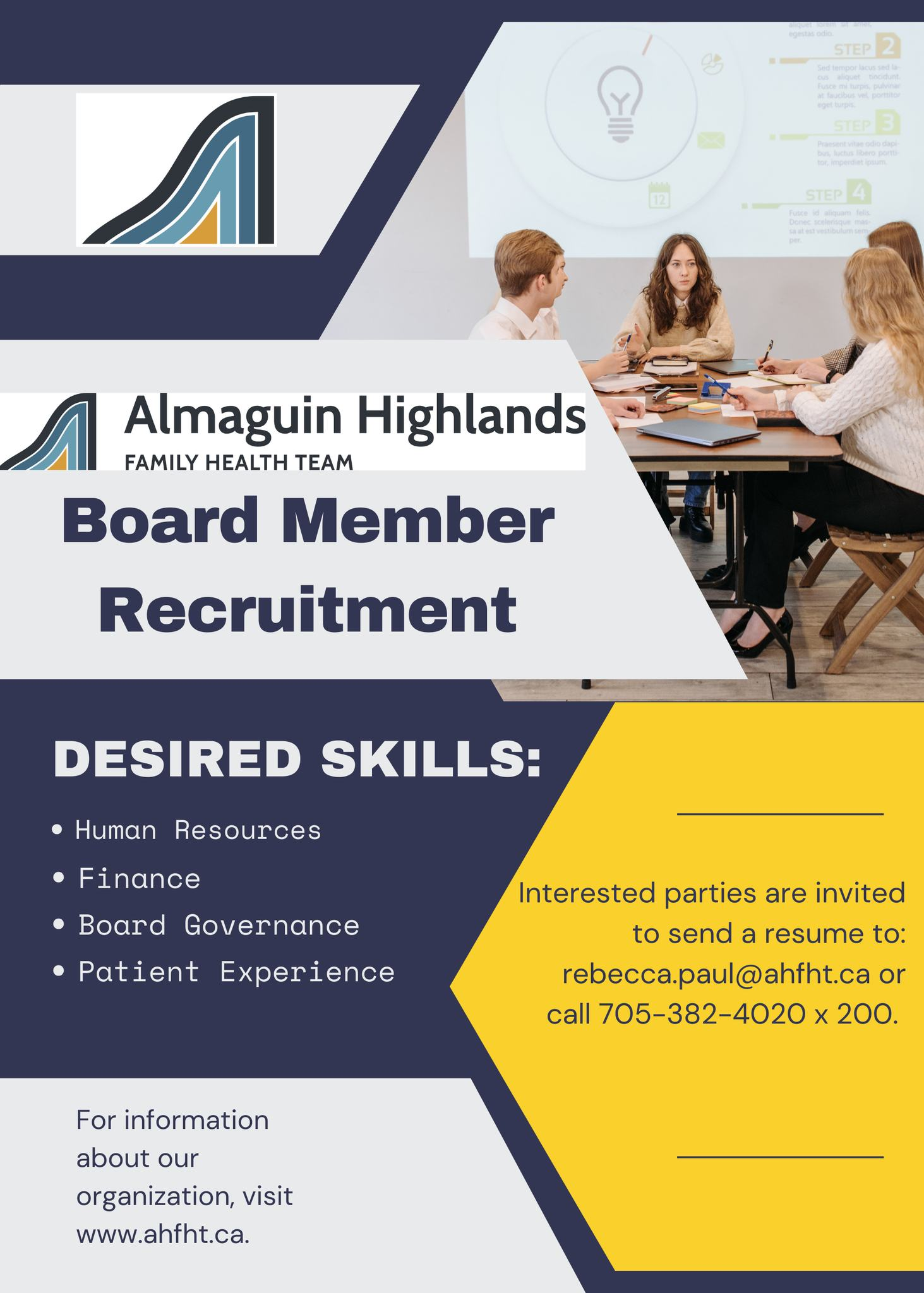 If you are interested in becoming a member of the board send a resume to: rebecca.paul@ahfht.ca or call 705–382-4020 x 200.