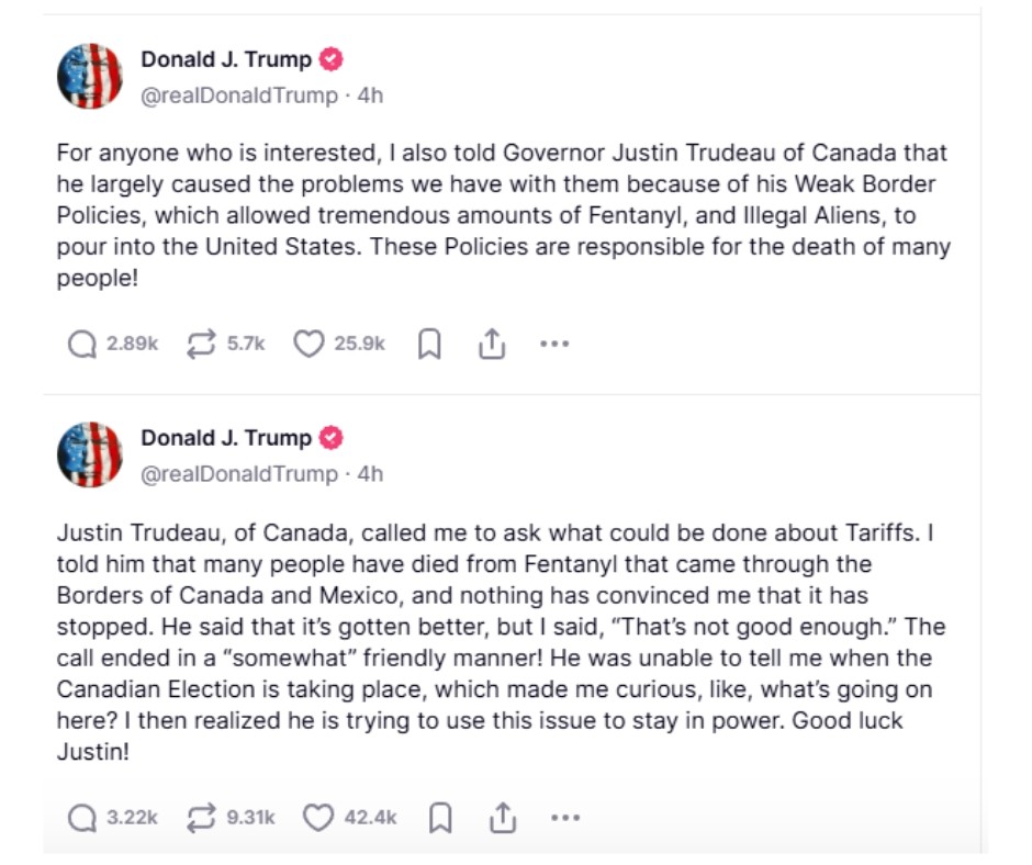 Trump took to Truth Social to say that he’d spoken to the prime minister. He stated that Trudeau “…largely caused the problems we have with them (Canada) because of his Weak Border Policies, which allowed tremendous amounts of Fentanyl, and Illegal Aliens, to pour into the United States.”