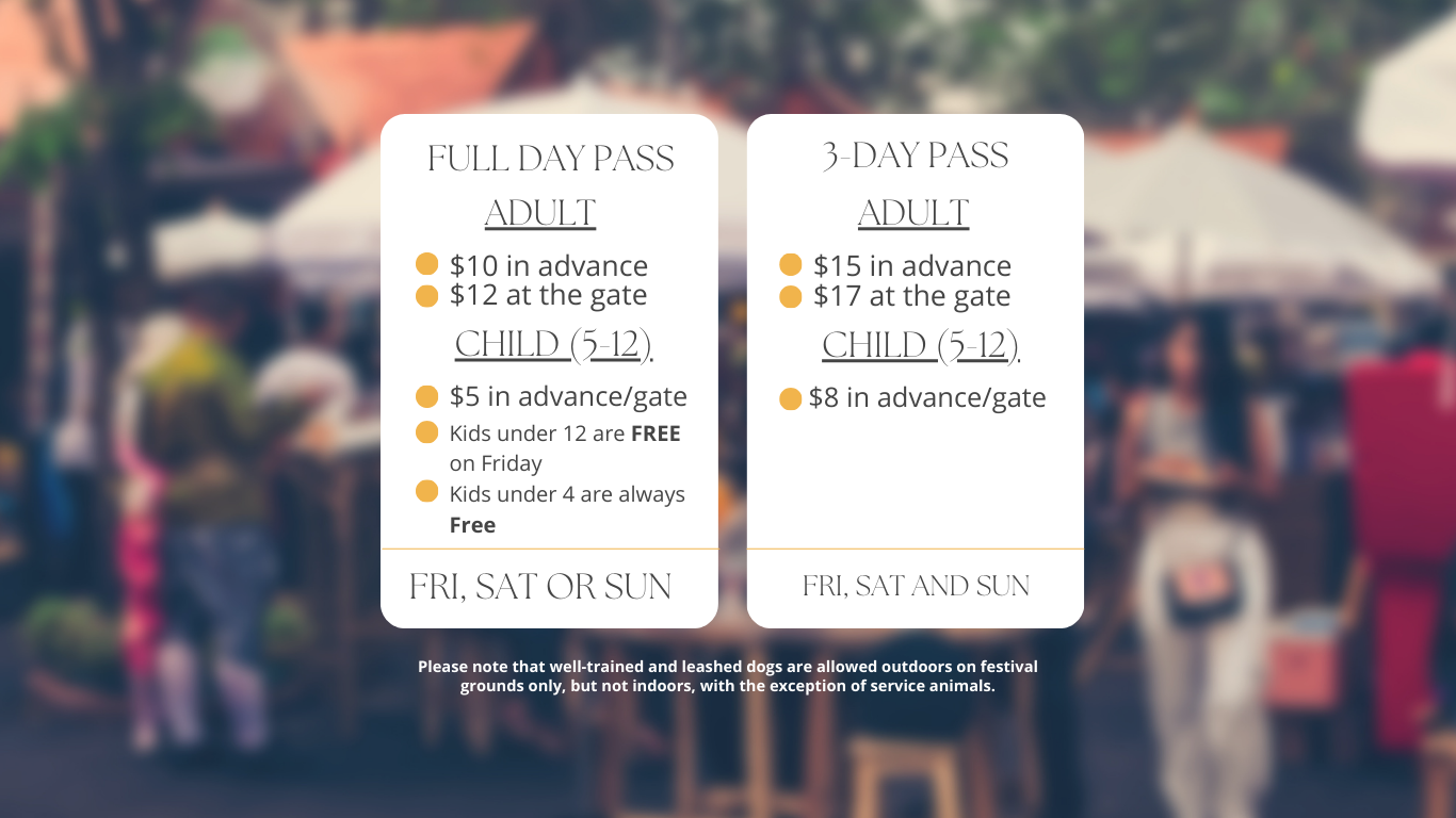 Please note: The festival is dog-friendly, welcoming well-trained, leashed dogs in all outdoor areas. Service animals are permitted throughout the festival grounds, including indoor spaces, with proof of service animal registration.