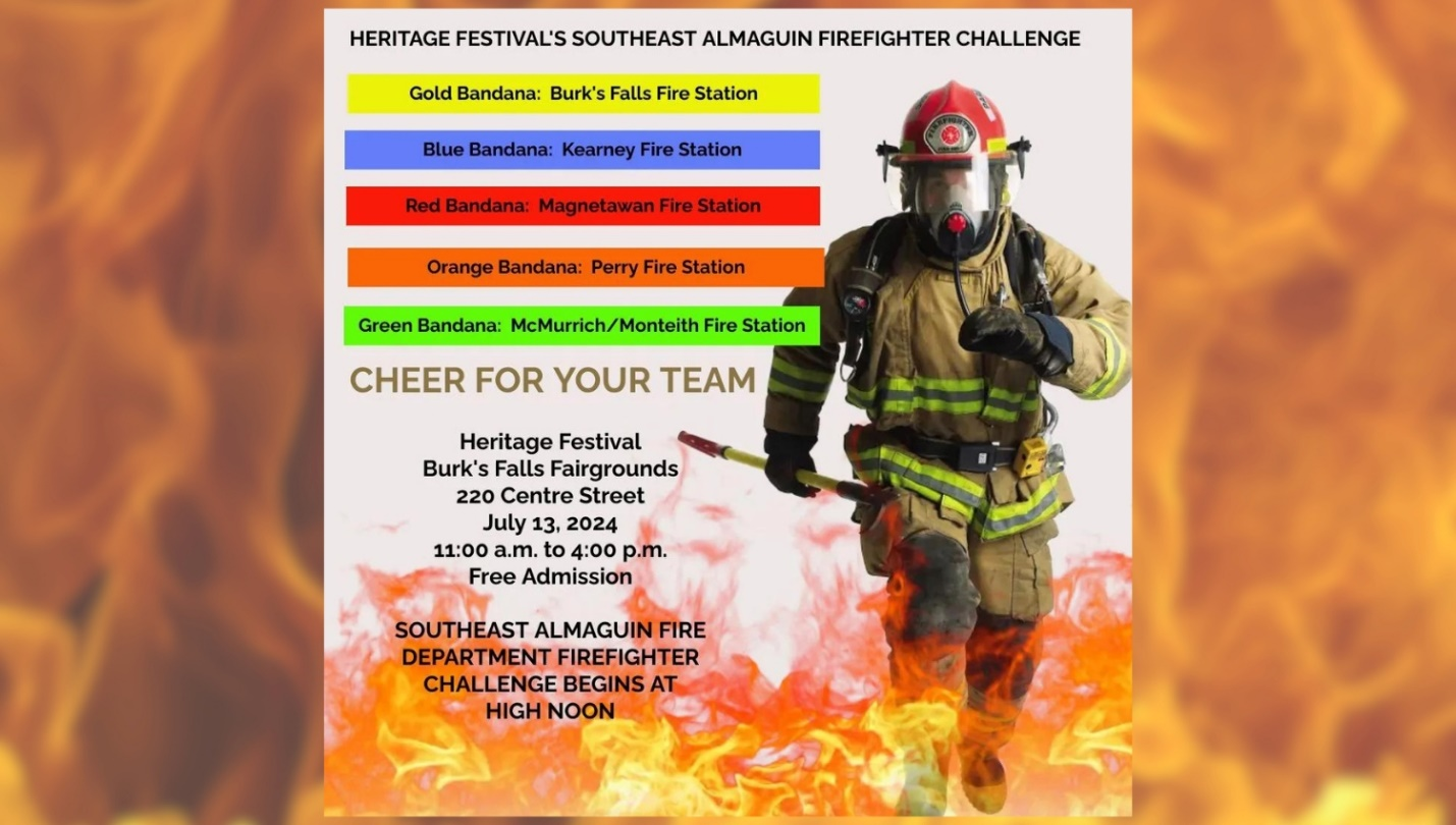 Of course, there will be over 100 vendors, games, food, exhibits and music. The highlight of the Heritage Festival will be the Firefighters Challenge featuring the Southeast Almaguin Fire Department (Burk’s Falls, Kearney, Magnetawan, McMurrich/Monteith and Perry Stations). You can support your town’s firefighters by wearing their colours!