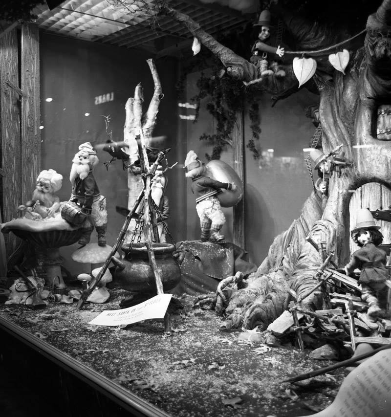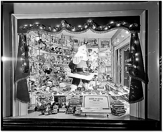 Following the Second World War, Eaton’s stores around Canada, but primarily in Toronto and Winnipeg, had elaborate displays featuring Christmas scenes and figures. Eaton’s had carols piped to the street, helping to create the Christmas atmosphere. In places like Winnipeg, displays were built by Second World War veterans and aircraft technicians. These animatronic displays were powered by war surplus motors. The figures danced and pranced in the display for three decades.