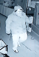 On March 27th, 2026 at approximately 2:50 a.m., an unknown suspect broke a window and gained entry to a restaurant on Main Street near John Street. An unknown amount of cash was taken. Video surveillance captured a suspect wearing a grey and black coat with hood up, dark pants and dark footwear with white accents.