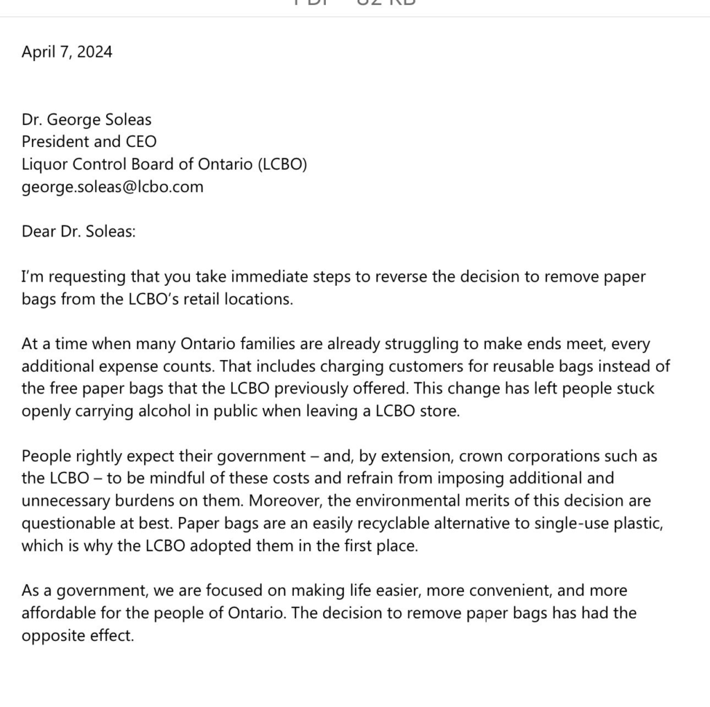 “At a time when many Ontario families are already struggling to make ends meet, every additional expense counts,” Ford wrote in the letter. “That includes charging customers for reusable bags instead of the free paper bags that the LCBO previously offered. This change has left people stuck openly carrying alcohol in public when leaving an LCBO store.”