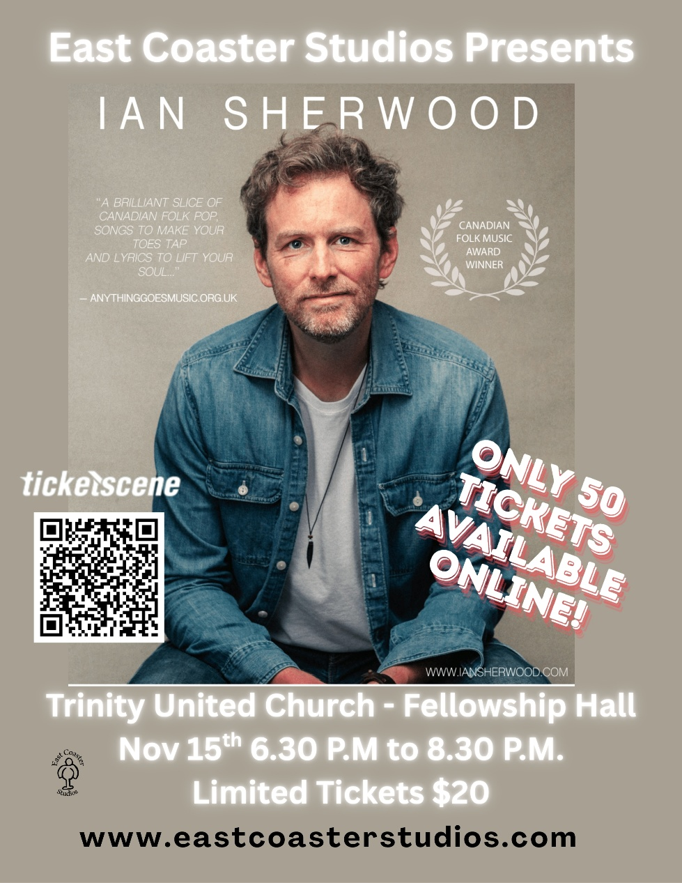 On Saturday, November 15th, Ian and East Coaster Studios will host an exclusive song writing workshop at Trinity United Church from 12:30 P.M. to 4:30 P.M. With only a few spots left, this is a rare opportunity to learn from one of Nova Scotia’s best. The workshop registration is $50 for adults and $40 for students, which includes admission to Ian’s intimate solo performance that evening at 6:30 P.M. The evening show ticket alone is $20.