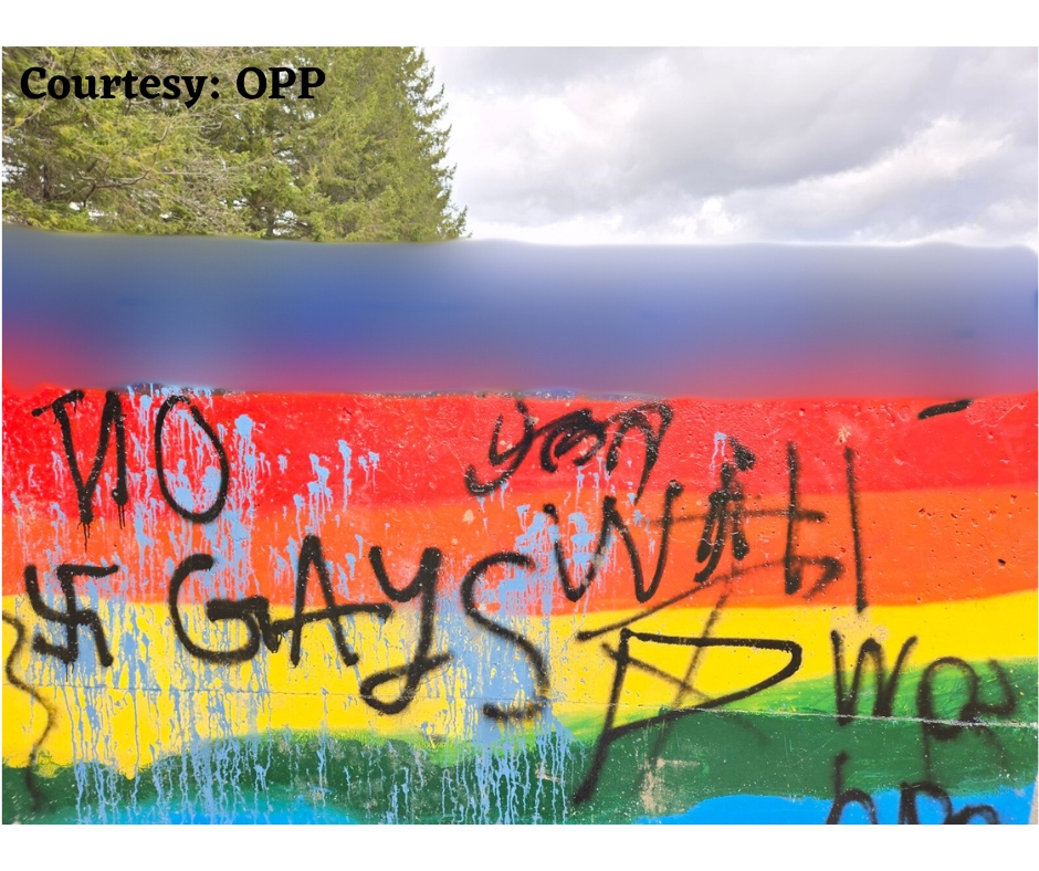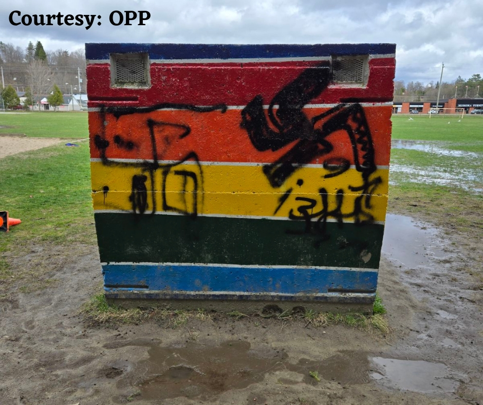 A concerned member of the community who wishes to remain anonymous has reached out to us about another incident of vandalism at Monck Public School in Bracebridge. According to our source, a shed painted in rainbow colours was defaced with swastikas. OPP have confirmed with us that a phone number was also painted on the shed.