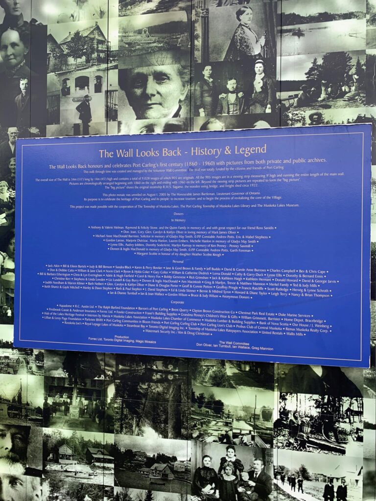 In 2004, the town decided that the central area of Port Carling needed a ‘makeover.’ A small team of residents formulated a unique idea that involved capturing the area’s history in a historical photo mosaic. The project’s goal was to “serve as a spectacular tourist attraction; to stimulate further revitalization of Port Carling; to foster community pride and to reflect the heritage of Muskoka Lakes Township.