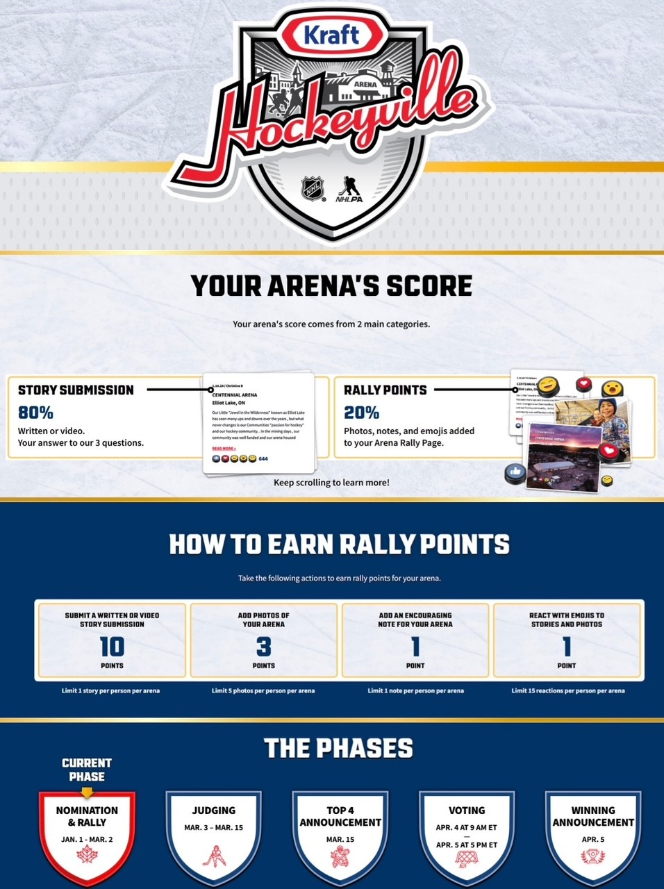 To win the coveted prize, the public is being asked to submit stories about their experiences at the arena and community centre, photos, and videos to the Kraft Hockeyville Contest website. Submissions are evaluated using a points system before voting and judging happens.