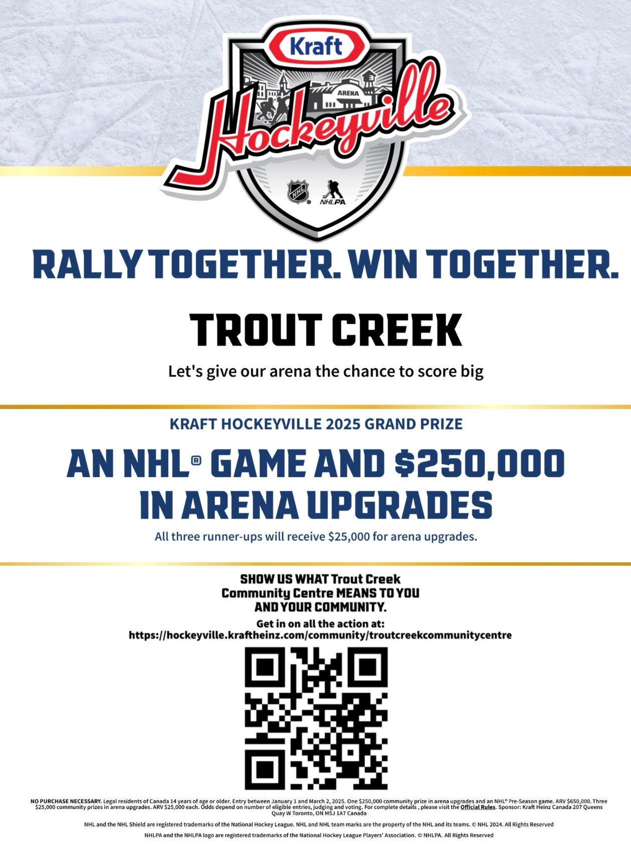 You don’t have to live in Trout Creek to participate in the contest. You can go to the Kraft Hockeyville website here or use the QR code on the poster below. Be sure to check out our video for our conversation with Travis and to see some of the fabulous photos that have already been submitted.
