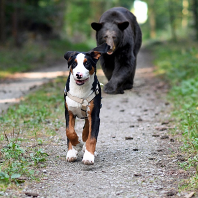 Unleashed dogs may harass a bear, then return to their owners. This can cause a chase response that may lead a bear back to the owner. Please keep your dog leashed to reduce the potential of a negative interaction with a bear.